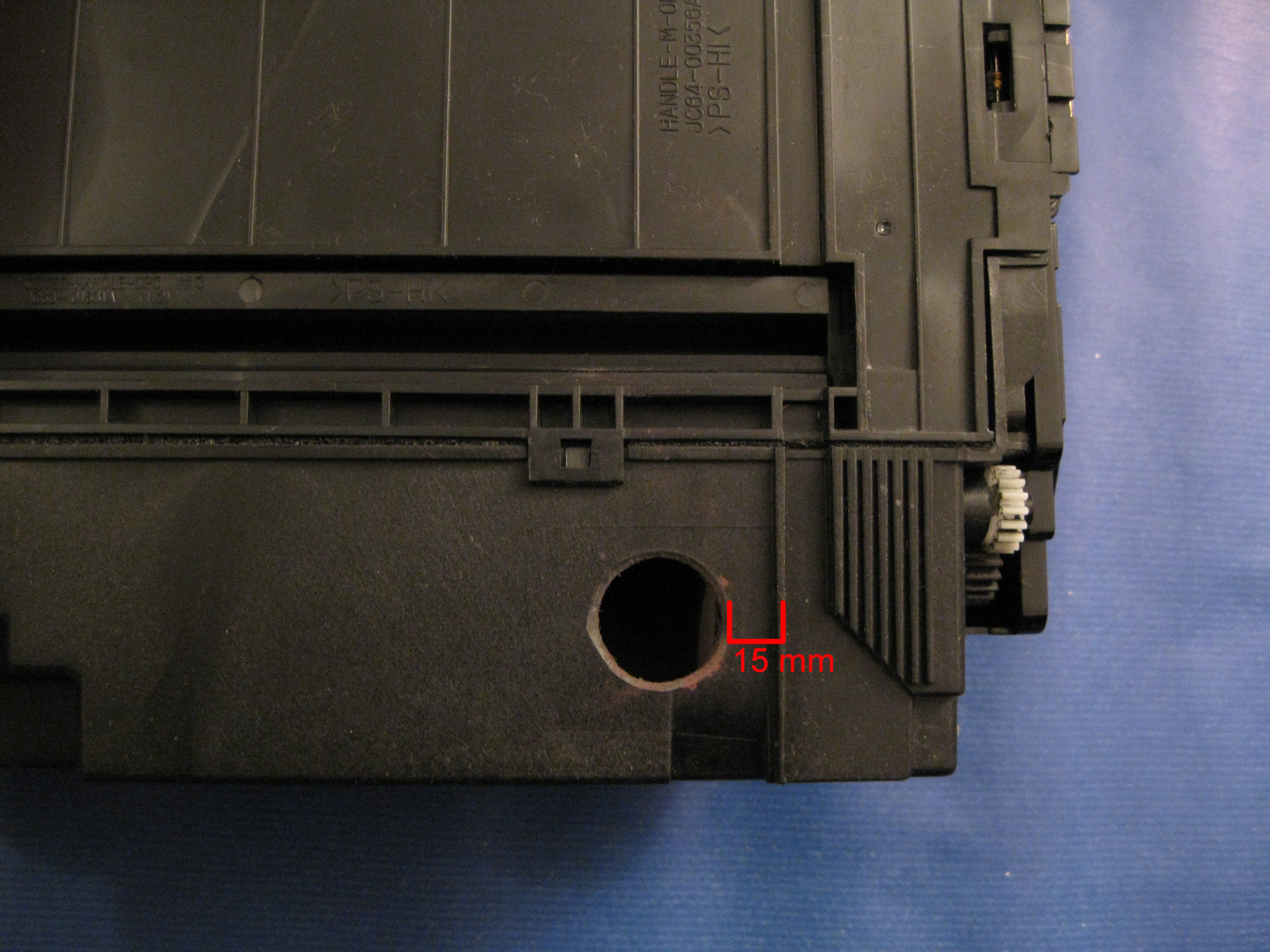 Por último practicaremos un orificio en el lugar señalado dejando la distancia indicada. A través de este orificio vaciaremos el tóner que se genera como residuo durante el proceso normal de impresión. Gracias a esto evitaremos perdidas de tóner residual, por tanto suciedad, en el interior de la impresora. Finalmente taparemos este orificio con cinta adhesiva.